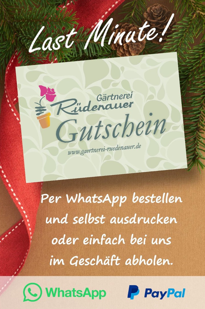 Sie können unsere Gutscheine auch telefonisch, per Kontaktformular oder per WhatsApp-Nachricht an die 07953 1005 bestellen. Anschließend bekommen Sie den PDF-Gutschein zugeschickt. Die Bezahlung sollte im Voraus erfolgen, per Überweisung, Kreditkarte oder per PayPal. Sie können den erworbenen Gutschein weiterleiten oder ausdrucken. Unkompliziert und schnell.